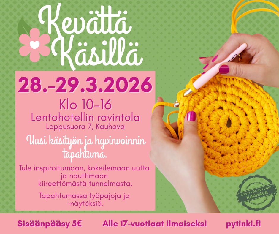 Kevättä Käsillä tapahtuma tulee ensimmäistä kertaa Kauhavalle 28-29.3.2026!  Tapahtuma järjestetään Lentohotellin ravintolan tiloissa, osoitteessa Loppusuora 7, Kauhava. Tapahtuma on avoinna asiakkaille molempina päivinä klo 10-16. Tämä kaksipäiväinen keväinen ja inspiroiva tapahtuma kokoaa yhteen käsityön- ja hyvinvoinnin ystäviä.  Kahden päivän aikana on luvassa työnäytöksiä, työpajoja, haastatteluja sekä muuta hyvää mieltä tuovaa ohjelmaa. Tapahtumassa on tarjolla keittolounasta […]